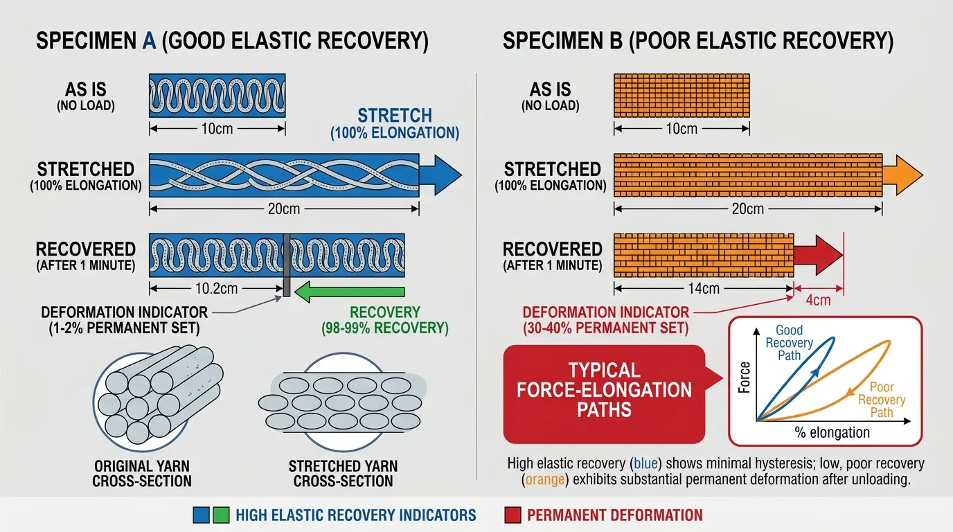 Without excellent recovery, the garment loses shape after 2 hours of wear. The waistband rolls down. The legs bag out. The customer feels unsupported and uncomfortable—leading to returns and negative reviews.