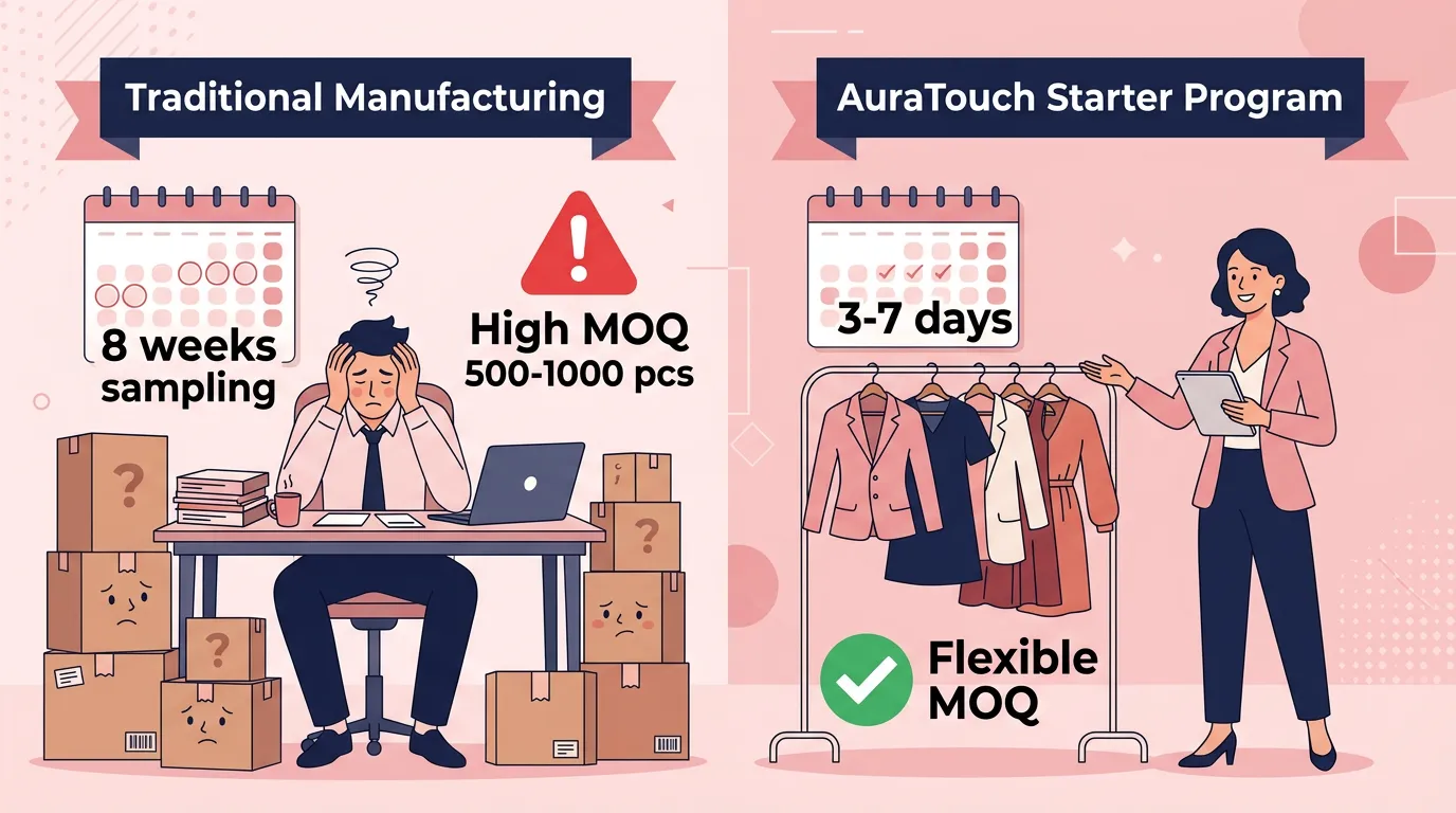 At AuraTouchGlobal, we created our Starter Program specifically to address the pain points that kill emerging brands before they launch. With 15 years of experience serving China's top domestic lingerie brands, we're now bringing our manufacturing expertise to support international startups.