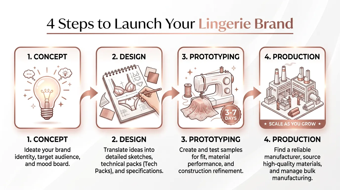 Creating a successful lingerie brand follows a clear process. Here's the roadmap from concept to customer: